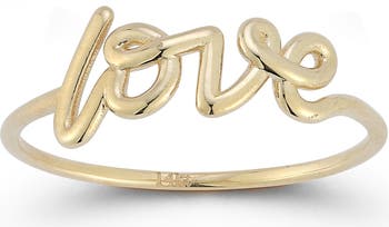 A fine 14-karat gold band ensures a lasting luster for this slender, stackable ring finished with an inspiring script.