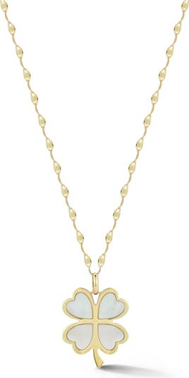 Crafted from 14k gold, this necklace showcases a mother-of-pearl clover pendant that brings a touch of luck to your look.