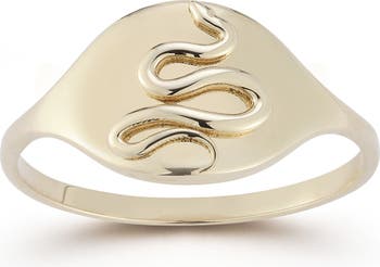A polished snake slithers up the center of this signet ring crafted from warm 14-karat gold.