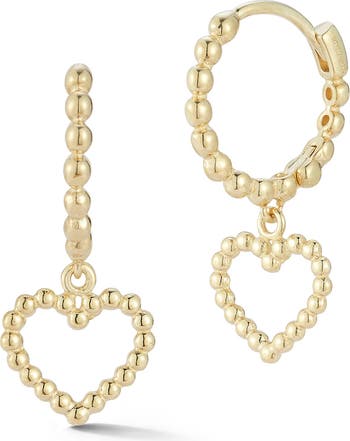 Crafted from 14k gold, these beaded huggie hoop earrings feature a heart drop that adds a lovely touch to your lobe look.