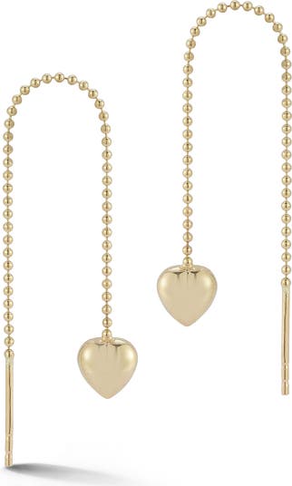 Crafted from 14k gold, these thread-through earrings feature heart drops that add a touch of radiance to your lovely lobe look.