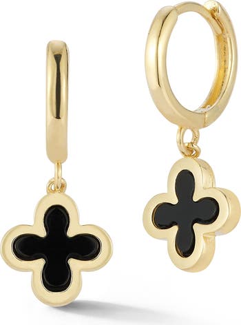 Crafted from 14k gold, these huggie hoop earrings feature an onyx clover drop that adds a lucky touch to your lobe look.