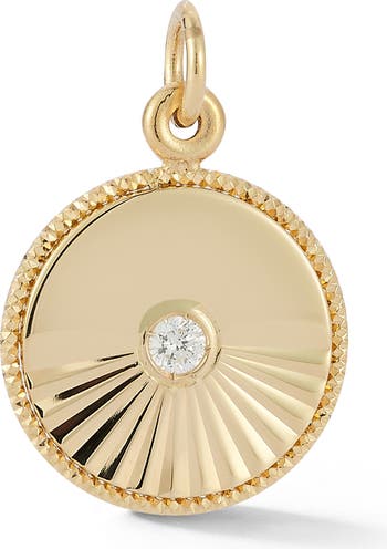 A prong-set round diamond brings dainty sparkle to this sunray-textured medallion charm crafted in Italy from warm 14-karat yellow gold.