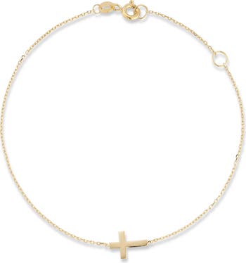 A small cross pendant adorns this dainty chain bracelet boasting an Italian-crafted 14-karat gold design.