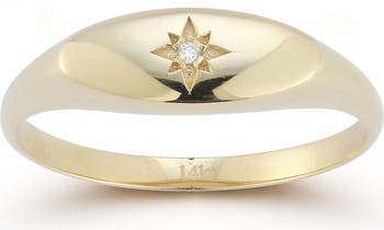 A single diamond accents this star-detailed signet ring crafted from gleaming 14-karat gold.