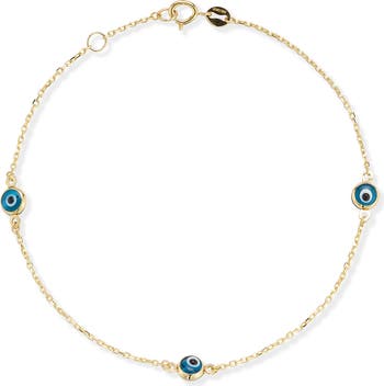 Ward off bad vibes in style with this 14k-gold bracelet featuring evil eye charms.