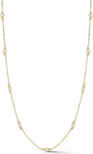 Freshwater pearl stations lend light luster to this delicate chain necklace rendered in 14-karat gold.