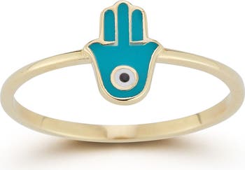 A meaningful hamsa design is paired with colorful enamel to top this signet ring crafted from gleaming 14-karat gold.