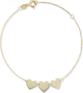 A trio of heart charms catches light on this dainty 14k-gold anklet.