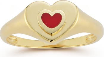 A red-enamel accent centers this heart-shaped ring crafted from gleaming 14-karat gold.