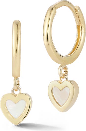 Lustrous mother-of-pearl lights up these elegant heart-shaped huggie hoop earrings finessed in warm 14-karat gold.