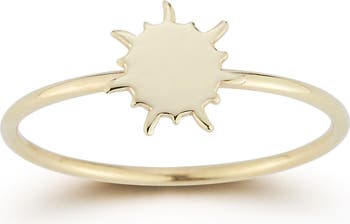 A unique sun-inspired design catches light at different angles on this delicate ring finessed in warm 14-karat gold.
