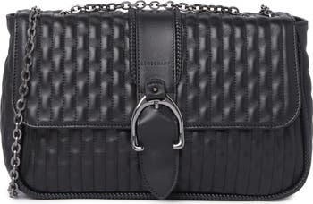 - - Pull through chain strap with leather shoulder pad - Flap buckled closure - Embossed leather exterior - Approx. 7”H x12”W x 4”D - Approx. 12-20” Adjustable Strap Length - Made in France This item cannot be shipped to Canada.