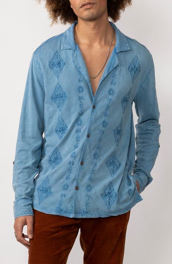 Geometric embroidery adds textural interest to a button-up shirt crafted from pure cotton.