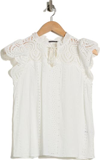 Breeze through sunny days in this airy embroidered-eyelet top framed by a tassel-tie keyhole and fluttery cap sleeves for charming boho style.