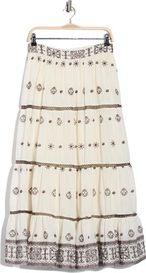 Contrasting embroidery brings bohemian charm to a tiered skirt cut from pure cotton for a lightweight feel even as the temp rises.