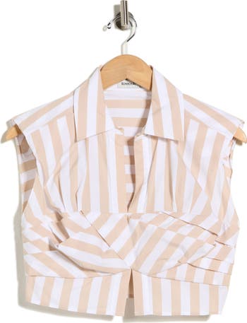 This cropped top features a spread collar and classic stripes, finished with a pleated wrap front for a structured yet modern look.