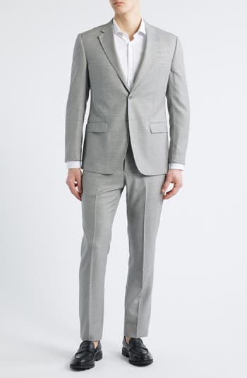 Subtly textured Egyptian wool distinguishes a wardrobe-staple suit that's cast in a pale-grey mélange and fitted in the waist for a smart, streamlined look. The flat-front trousers complement the traditional detailing to keep the silhouette crisp and clean.