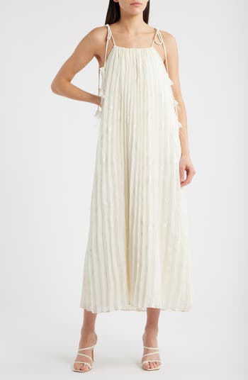 Hit refresh for white dress season with a flowy option textured in tonal blooms and hung from tied straps that finish with a flower.