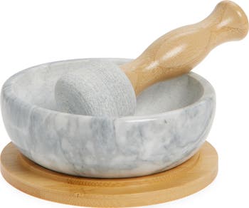 Grind your favorite spices and herbs to perfection with this mortar and pestle set made from marble and finished with a wooden base.