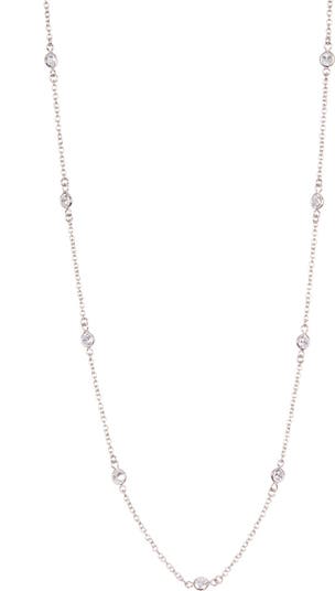 A lengthy chain necklace is set with cubic zirconia stations for added gleam against any ensemble.