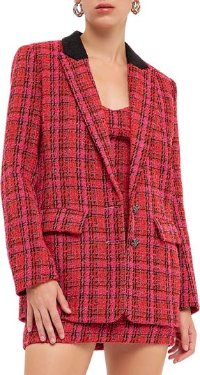This festive bouclé blazer is patterned in lively plaid with a contrasting collar and flap pockets.