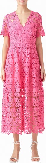 Charm from day to night in this lovely lacy midi designed with sheer accents and abbreviated sleeves.