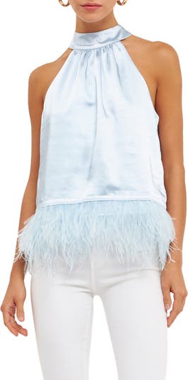 Fabulous feathers trim the hem of this slinky satin halter top finished with a bow at the back neck.
