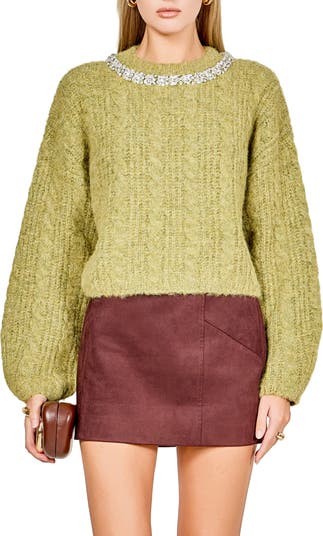 Lustrous neckline jewels adorn this woolly cable-stitched sweater knit with dropped shoulders for a relaxed fit.