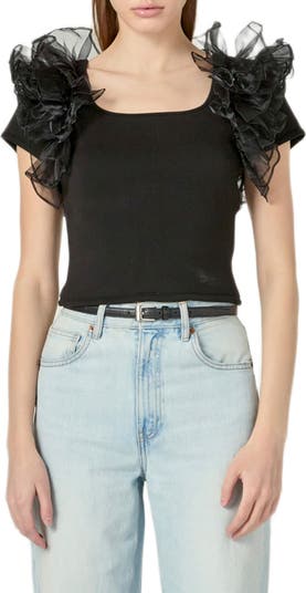 Ruffled organza trims the cap sleeves of a figure-hugging top designed to take casual looks to the next level.