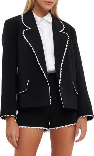 Scalloped trim brings chic style to this charming blazer crafted in a one-button silhouette.
