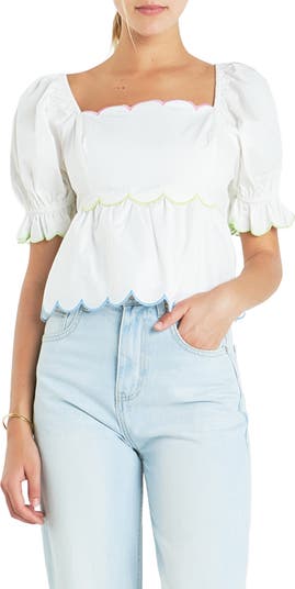 Hints of color call out the sweetly scalloped edges of this winsome top cut from crisp cotton and finished with a pretty peplum.