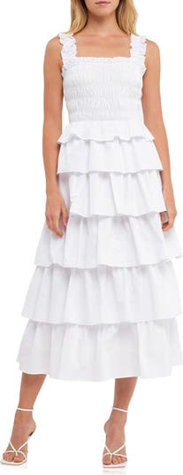 Exude happiness in this sundress featuring a shirred bodice, ruffles and a tiered skirt all crafted from breezy cotton.