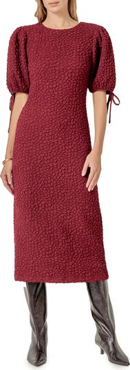 Puffed elbow-length sleeves with ties at the cuffs elegantly frame this pretty midi dress textured by a touchable popcorn-knit design.