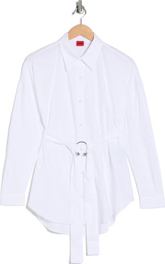 A tie belt with unique hardware cinches the waist of this button-up shirt made from crisp cotton poplin.
