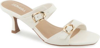 Add chic lift to your look with this squared-off, croc-embossed sandal featuring thin double straps with sculpted, gleaming buckles and set on a gently flared heel.