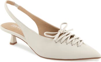 Glossy grommets and laces add corset-inspired detail to the open vamp of a pointed toe pump with a memory-foam cushioned footbed and easy-wear kitten heel for everyday comfort.