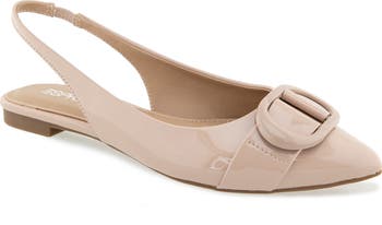 An oversize buckle and high-gloss finish polish a pointed toe flat with a memory-foam cushioned footbed and easy-wear slingback strap for everyday comfort.