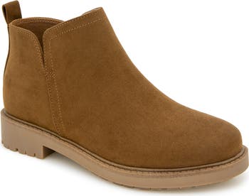 A low block heel and lugged sole lift a memory foam-cushioned bootie fitted with a side zipper for a secure fit.