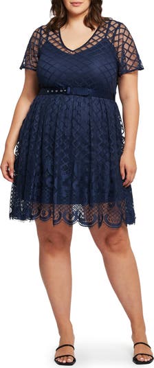 A satiny belt defines the waist of this lacy dress designed with semisheer accents and a scalloped eyelash-trimmed hem.