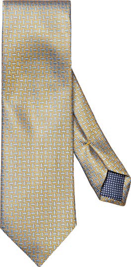 A geometric design lends texture and distinction to a sophisticated tie woven from lustrous Italian silk.