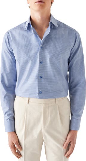 Sharp checks add visual texture to a modern dress shirt shaped from a stretchy cotton blend for a flexible fit. Smart cuffs convert from button to French for added versatility.