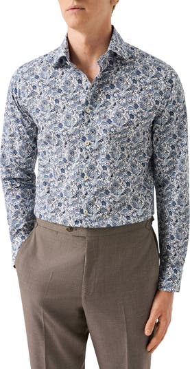 Soft Italian cotton scattered in a floral-paisley print brings comfort and distinction to a dress shirt designed with a low, stay-tucked hem and styled to brighten any semiformal look. The crease-resistant finish keeps you crisp and smart, even when you travel.
