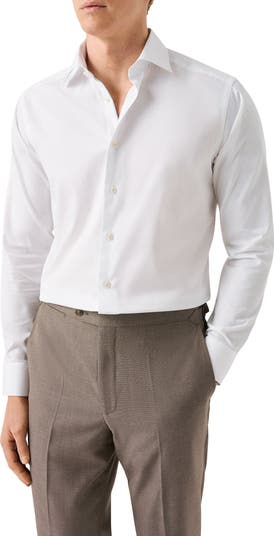 Soft Italian cotton in a solid white hue brings comfort and versatility to a dress shirt designed with a low, stay-tucked hem and styled to brighten any semiformal or formal look. The crease-resistant finish keeps you crisp and smart, even when you travel.