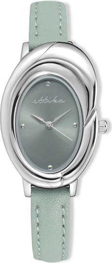 An oval-shaped case and gleaming minimalist indices complete the elegant design of a three-hand watch secured by a timeless leather strap.