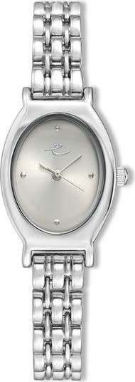 A two-tone finish lends striking detail to a precise timekeeper defined by a modern oval dial centered by minimalist markers and slender hands.