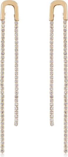 Glass crystals twinkle at the long, slender chains dangling from U-shaped drop earrings.