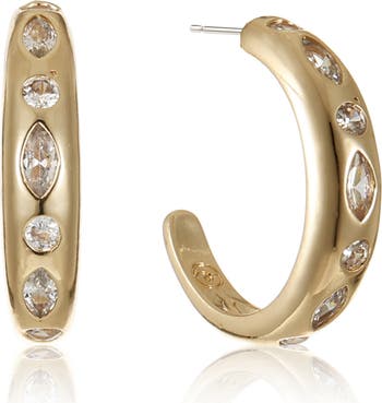Marquis- and round-cut cubic zirconia lend bright-white shine along the front of polished hoop earrings that instantly warm your stack.