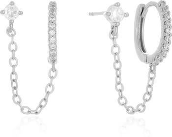 A delicate chain drapes between two piercings in these statement-making earrings capped with a mismatched hoop and stud.