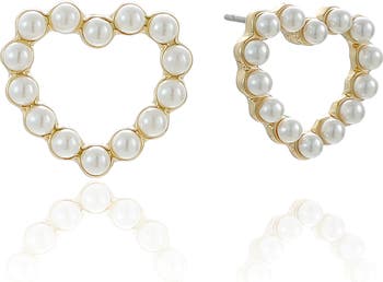 Add instant sweetness to your lobes with these heart-shaped stud earrings defined by bezel-set faux pearls.